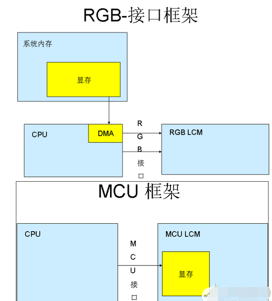 MCU-LCD屏它與RGB-LCD屏主要區別在于顯存的位置。RGB-LCD的顯存是由系統內存充當的,因此其大小只受限于系統內存的大小,這樣RGB-LCD可以做出較大尺寸,象現在4.3"只能算入門級,而MID中7",10"的屏都開始大量使用。而MCU-LCD的設計之初只要考慮單片機的內存較小,因此都是把顯存內置在LCD模塊內部.然后軟件通過專門顯示命令來更新顯存,因此MCU屏往往不能做得很大。同時顯示更新速度也比RGB-LCD慢。顯示數據傳輸模式也有差別。RGB屏只需顯存組織好數據。啟動顯示后,LCD-DMA會自動把顯存中的數據通過RGB接口送到LCM。而MCU屏則需要發送畫點的命令來修改MCU內部的RAM(即不能直接寫MCU屏的RAM)。所以RGB顯示速度明顯比MCU快,而且播放視頻方面,MCU-LCD也比較慢。